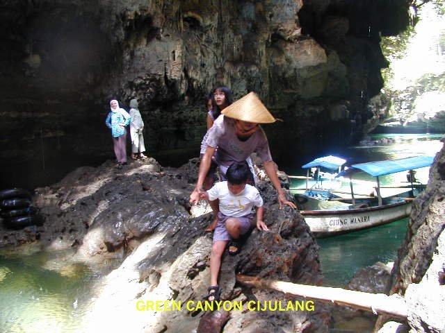 The goal is tunnel-like cave which is under the land bridge, known as Green Canyon Cave. To reach the cave, you must use a boat down the river Cijulang known as motorized. The boat was only able to be boarded by 5 passengers. Price rent a boat or motorized Rp 75.000, - per boat. The time required to travel that starts from the pier to the caves Ciseureuh approximately 30 minutes. In Cijulang river side you can enjoy climbing the hill is overgrown with lush green trees and rocks that decorate it. The trip will not be boring because of the beautiful scenery and relaxed enjoying the river flow. Naik ketinting also can create its own uniqueness, especially for kids who love air.Saat almost there, the path will be narrowed so that the boat had to take turns to enter this path. There is also a regulator that provides direction for the driver to drive the boat for an orderly. Near the mouth of the cave, ketinting no longer be able to deliver you and your entourage because the path can not be traversed.